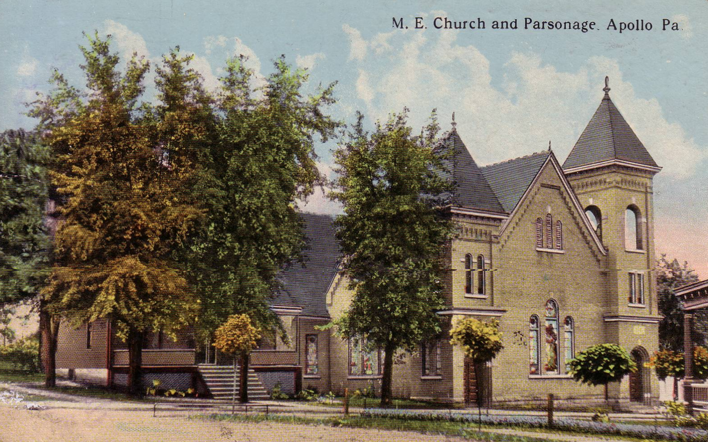 The Apollo First United Methodist Church has had a heritage of faithfulness and service to the Risen Lord. Sometime in the 1820’s a group met to form a society that met in the homes. By 1830 there were enough Methodists in Apollo to desire a church building. The exact date when the old log church was built is unknown, but a deed to Lot #15, giving the names of the previous, says, “The same was conveyed to David Risher by deed bearing the date of the eleventh day of January, one thousand eight hundred and thirty for the purpose of erecting thereon a House of Public Worship for the Methodist Episcopal Church.” A log church was built at the rear of the former First United Methodist Church in Apollo. In one of the membership records there is a portion of a bulletin which gives the date of the first church as 1838.